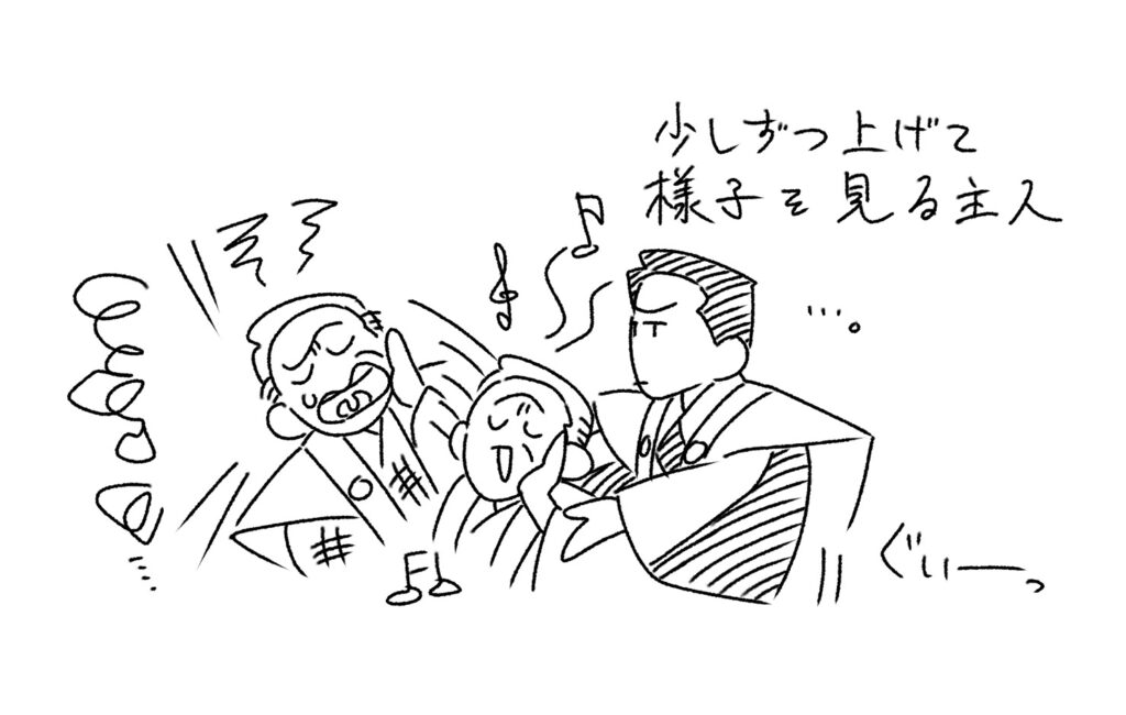 そこを利用して、寝たまま謡う太郎冠者を不信に思った主人が、身体を持ち上げてみるという動作を繰り返し行います。