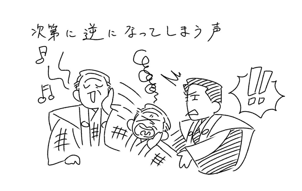 最初のうちは寝ていると声が出、起きては声が出ないと対応していますが、ふとしたことでそれが逆になってしまい、寝ていて声が出ず、起きると朗々と謡うようになります。