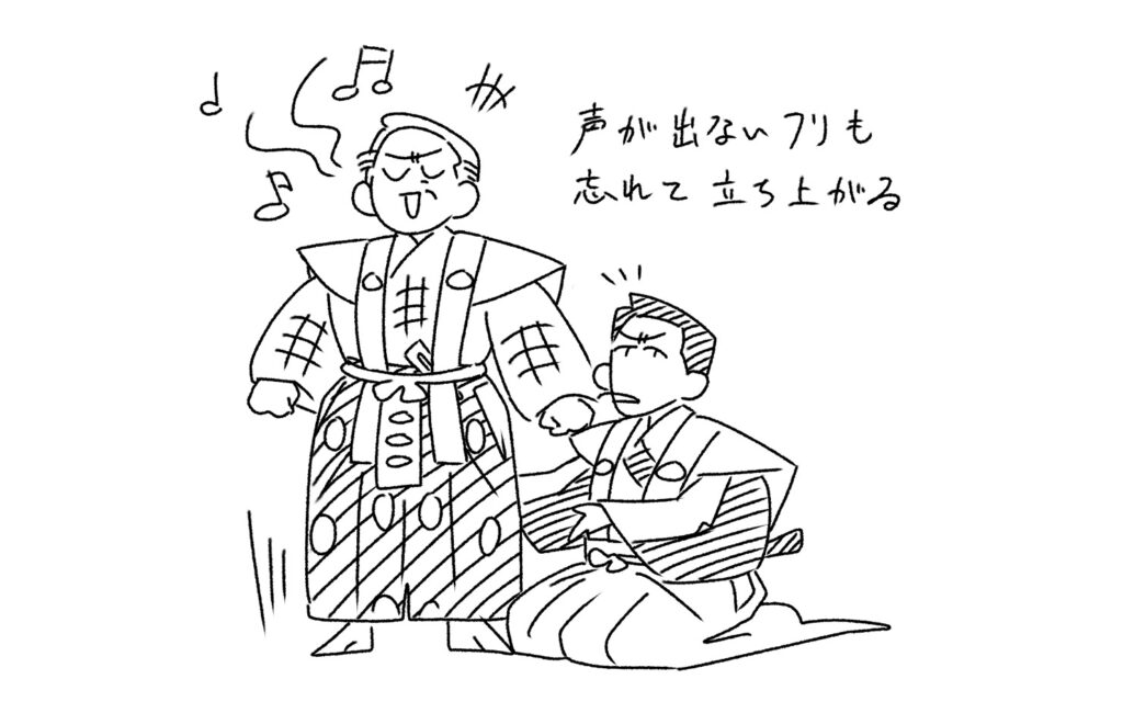 主人はいつから太郎冠者の策略に気づいたのでしょう。起きて声がでるとなったときのあきれ顔、あるいは怒り? どのような反応をしているのか、太郎冠者の演技に注目するのはもちろんですが、主人の反応の仕方も見ものです。