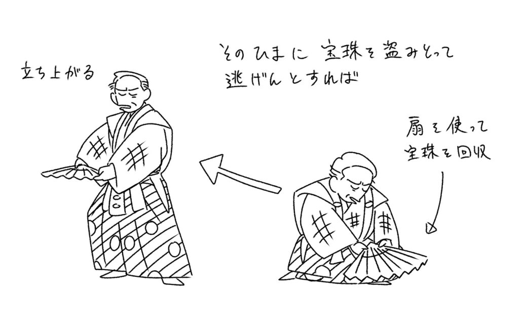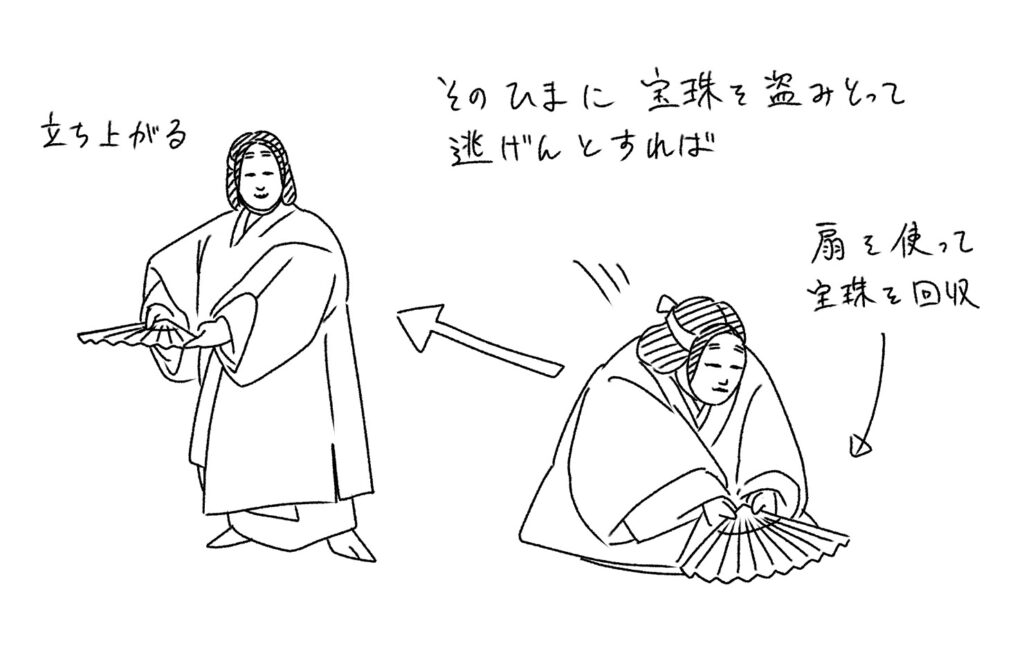 描いてくれた絵は、竜宮城に飛び込み、守護をしている龍神や恐ろしげな魚たちが、その勢いに驚いてさっと道を空けた隙に、宝珠を盗み取って逃げる場面です。玉を取る動作と後ろを振り返って追う者の様子を確かめるという型どころです。たった一人で演じますが、振り返ることによって、守護神が追っかけていることも感じられる、面白い型ですね。