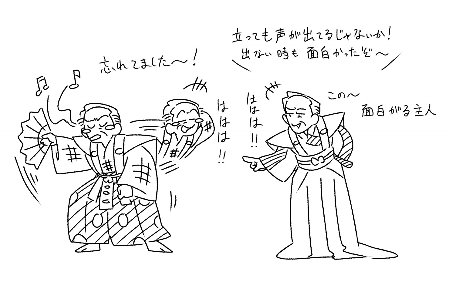 和泉流の場合ですと、常日頃主人のわがままにうんざりしている冠者が、この際思いっきりからかってやろうと、じゃれついたり、大げさに声が出ない様子を見せた挙げ句、うそがばれて叱られるという展開です。