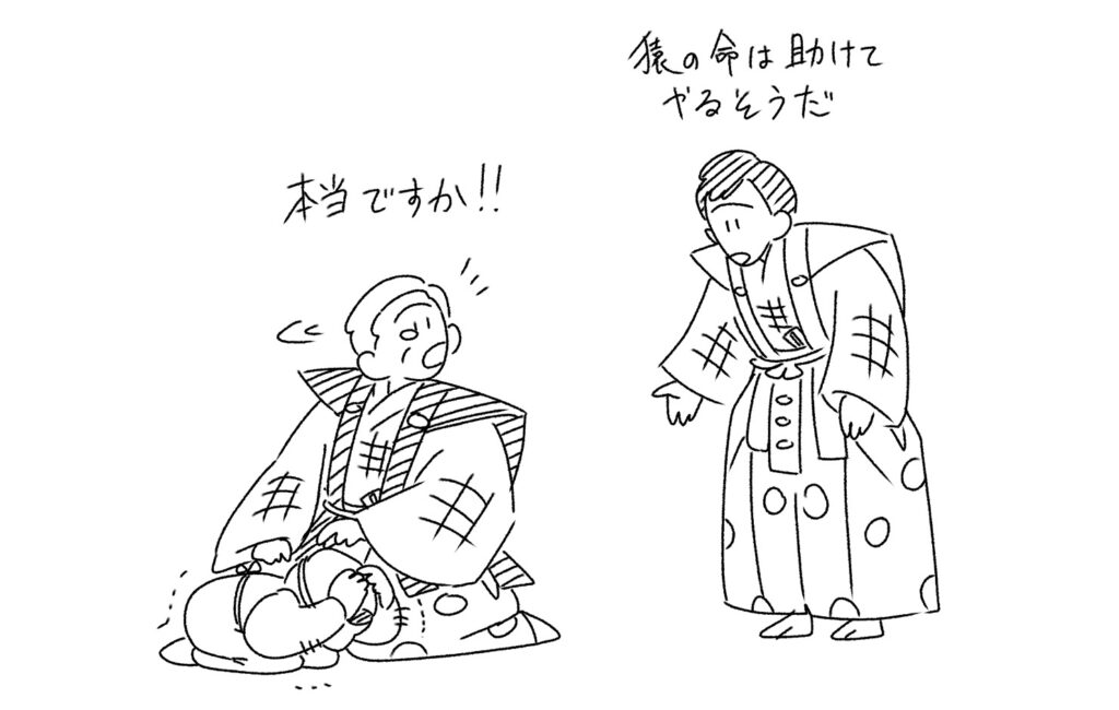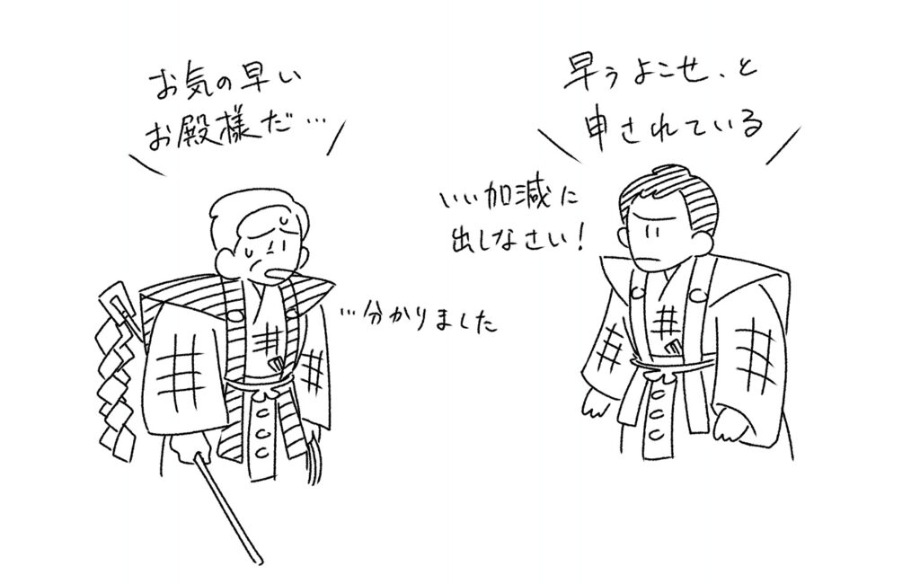 太郎冠者から事情を聞いた大名は、自分の命を取るために振り上げられた鞭で舟を漕ぐ芸をすると聞いて、急にかわいそうになります。