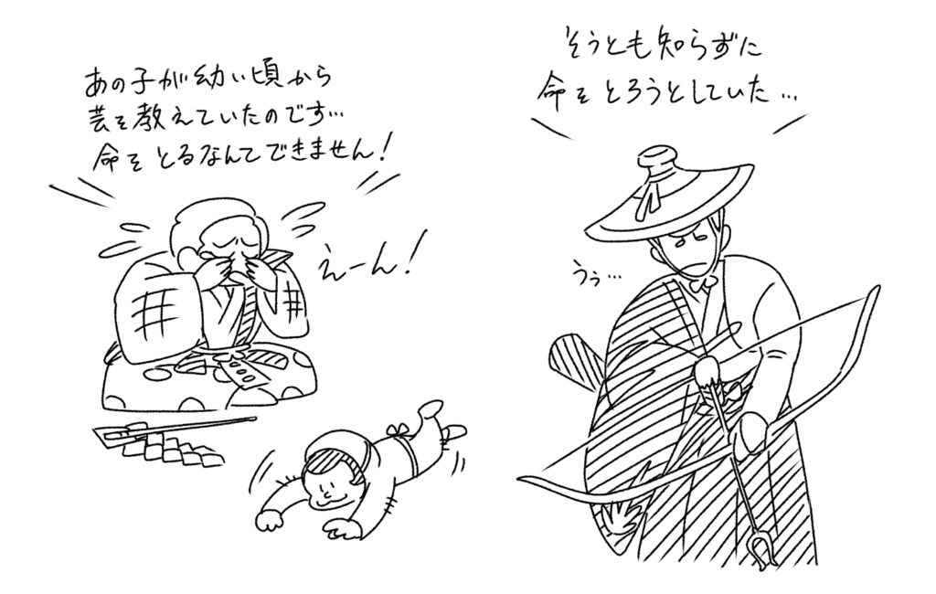 あくまでも拒絶する猿引に対して、大名は矢を射かけます。