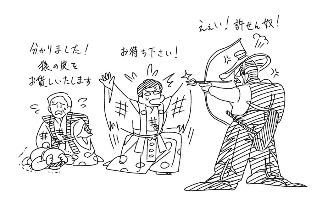 太郎冠者もびっくりして慌てて止めようとしますが、大名の怒りは収まらず、猿引ともども射殺すつもりです。