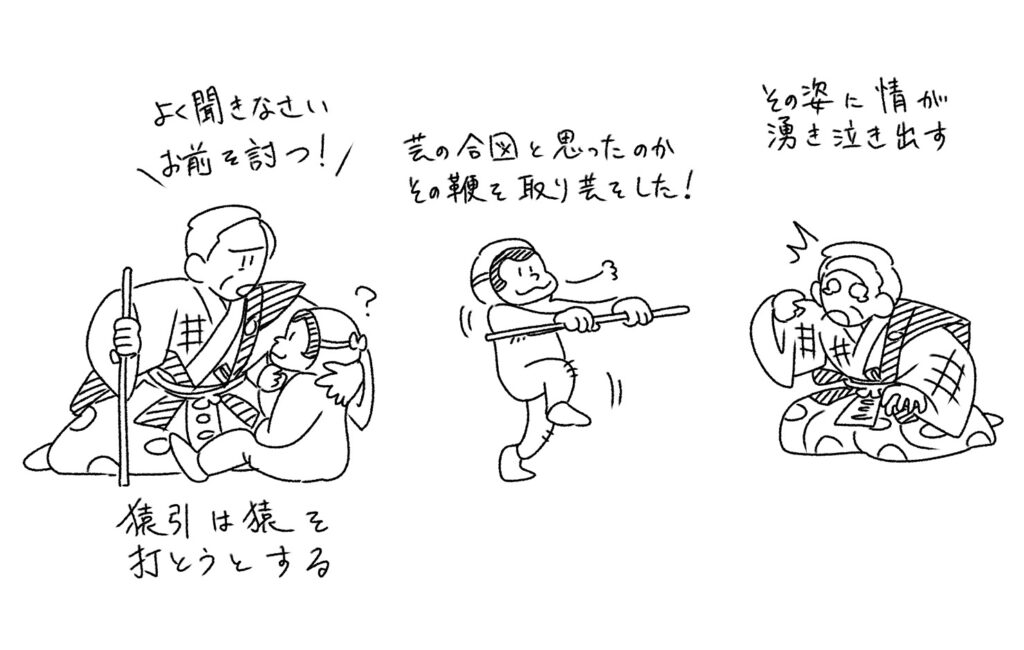 猿引は猿を引き寄せ、小猿のころから飼い育てて、いろいろ芸を仕込んだこと、今ではおまえのお陰で一家が生活できていることなどを話します。