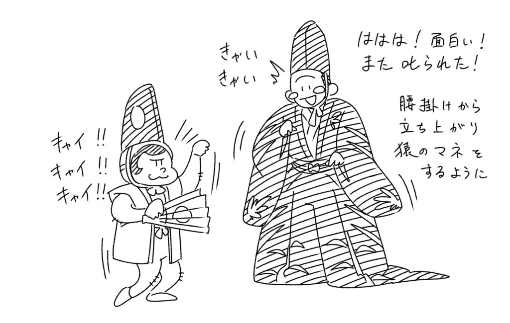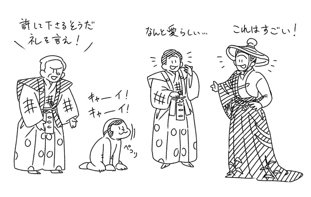 猿は舞を舞いながら、時々大名にちょっかいをします。その様子が可愛くて、大名はもう夢中です。座っていられなくなり、立ち上がって、猿の動きを真似ようとします。