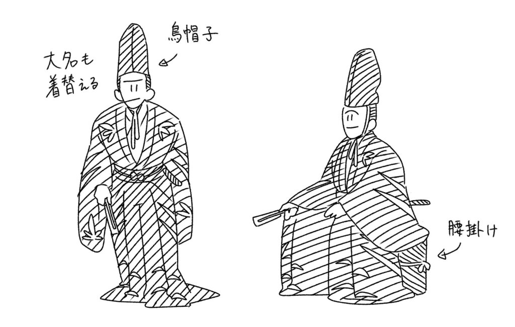 この時初めて大名の顔の全体がはっきり見えます。今までは笠に隠れて、表情までは見えなかったのです。そのために不気味な恐怖を抱かせる効果がありました。烏帽子姿になってみると、陽気でのんきなお殿様でした。