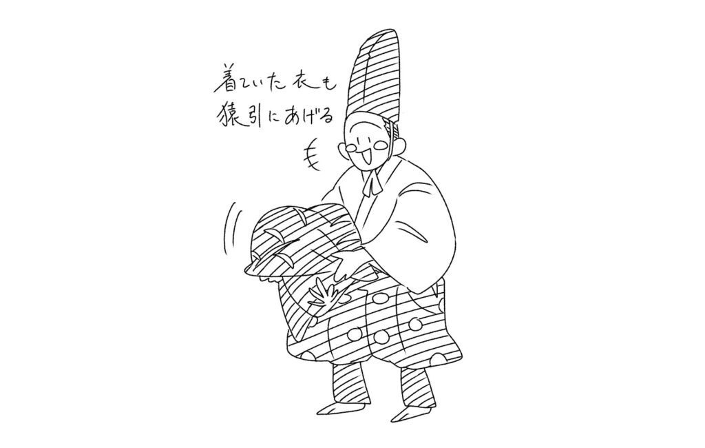 とうとう素襖上下熨斗目(素襖の下に着ていた着物)も太郎冠者に手伝わせて脱いでしまい、それも猿引に与えます。