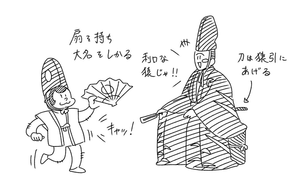猿が「猿歌」(猿引と地謡が歌う)に合わせて舞を舞うと、大名はたいそう喜んで、扇を続いて太刀を猿引に与えます。