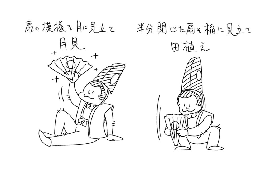 猿は猿引に命じられるまま、月見や田植えなどの型を繰り広げます。大名もそれを真似て、面白がっています。