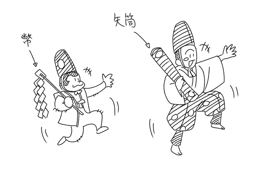 最後に猿引は御幣を猿に渡し、祝言の舞となります。大名は適当な物が見当たらないので、靱を幣の代わりにして、真似をします。