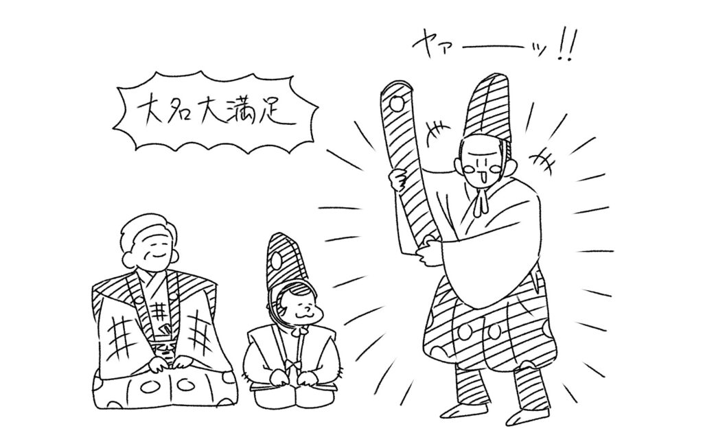 狂言に登場する大名は、どの曲の場合も常人とは異なっていて、常識しらずで浮世離れした感じが濃厚です。おそらく一般の観客たちにとっては雲の上の存在なので、その雲の上感が強調されているのでしょう。実際の大名が観客である場合は、自分とのあまりの違いのために、クレームを付けるよりも笑って済ませるという反応になるよう、配慮されているのではないでしょうか。