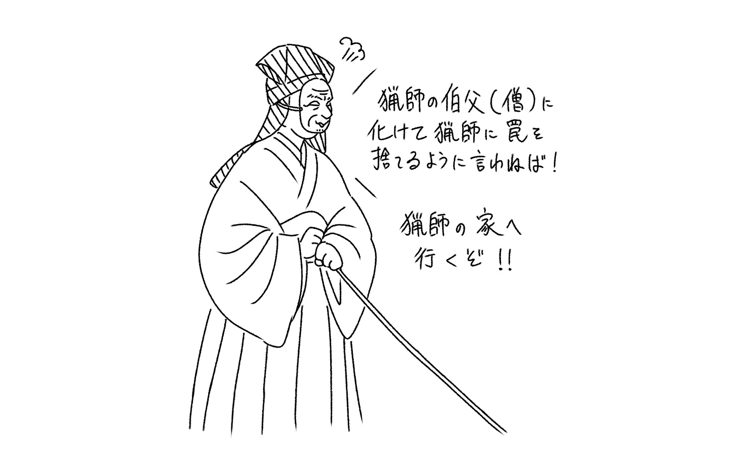 男には白蔵主という伯父がいて、その人の言うことは良く聴くということなので、今日は白蔵主になりすまし、行って意見して狩をやめさせようと思うと言います。