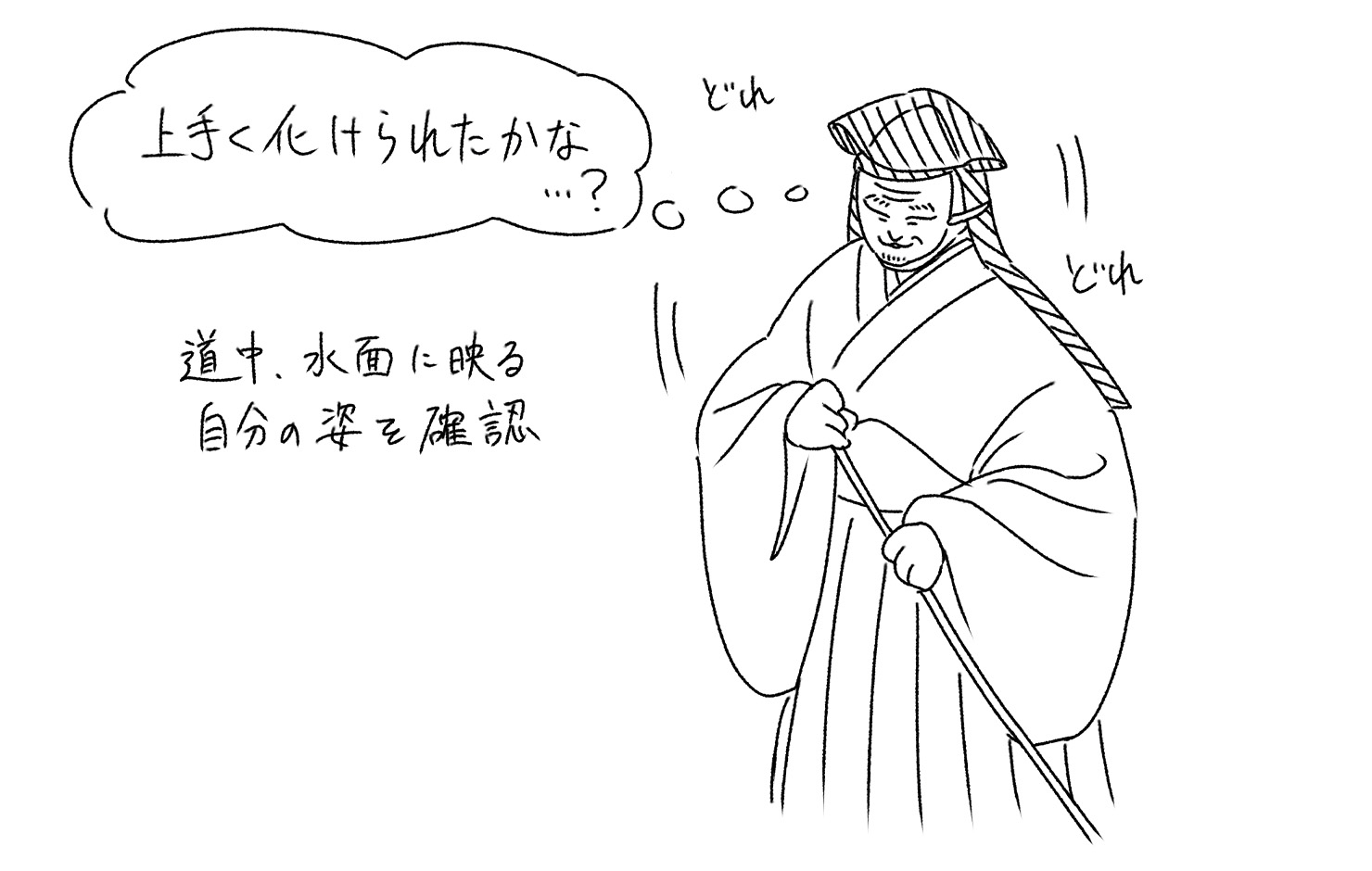 道中で、水に姿を映して上手く化けられているか確認する「水鏡」の型があります。これは秘事の一つで、重い習事となっていますが、万作師はただ下を向いて見るだけでは何をしているのかわからないだろうからと、能舞台の橋掛りにある欄干を利用して、そこから白洲を覗き込むという工夫をしています。これなどは、ドキュメンタリー1)で取り上げられていたので、自然に注目してみる場面となりました。