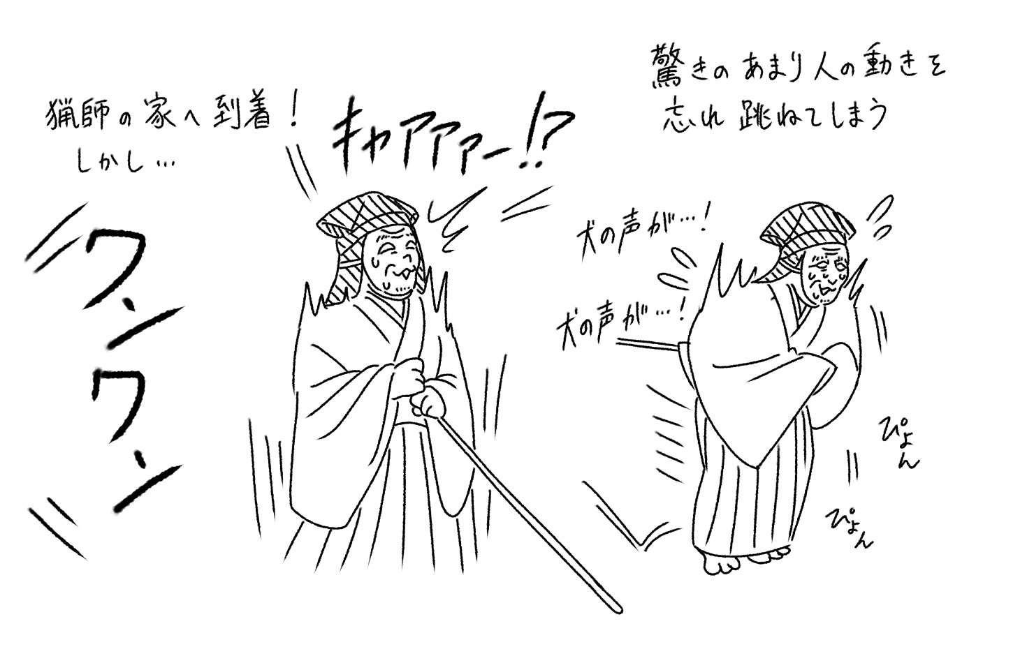 この後やはり能風の道行の謡「住みなれし、わが古塚を立ちいでて、わが古塚を立ちいでて、足に任せて行く程に、足に任せて行く程に、猟師の許に着きにけり。」があり、猟師の家に到着しますが、その時、ここ家の取り得は、犬がいないことだというセリフがあります。狐は犬が苦手ですから、番犬が居る家にはおいそれとは近付けないのです。ところがここで犬の声に驚いて、慌てふためくという見せ場があります。今まで沈着冷静な感じを一応保っていたのが吹き飛んで、オタオタする場面です。ここも型どころで、秘事となっています。