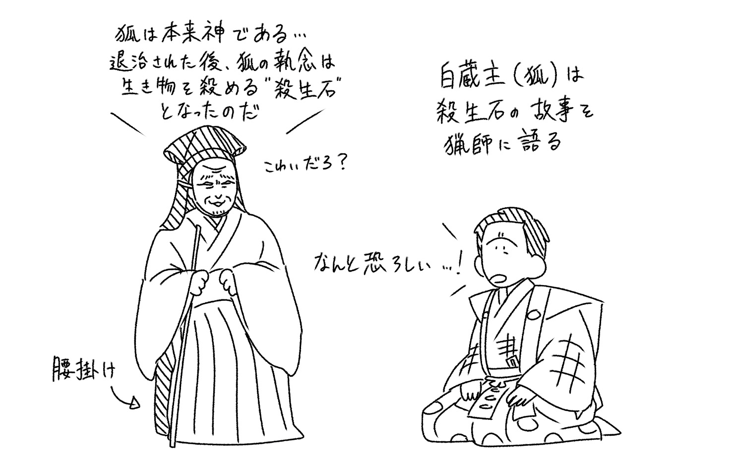 貴僧高僧の祈禱は効き目がなく、泰成が薬師の法(薬師如来を本尊として行う密教の厄難を取り除く修法)を行うと、苦しくなって内裏を飛び出し、下野の国(栃木県)那須野の原へ逃げていった。