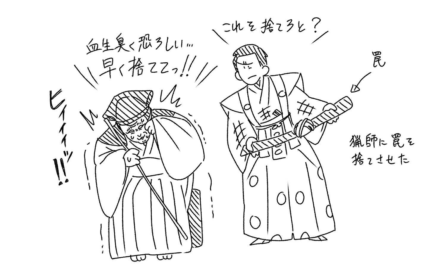 猟師は殺生石の物語を神妙に聞いていたようで、「もう狐釣りは止めるので安心してください」と言います。しかし目の前で罠を捨てろと言われると、すんなりとは従いません。やはり釣りを止める気はなさそうですね。