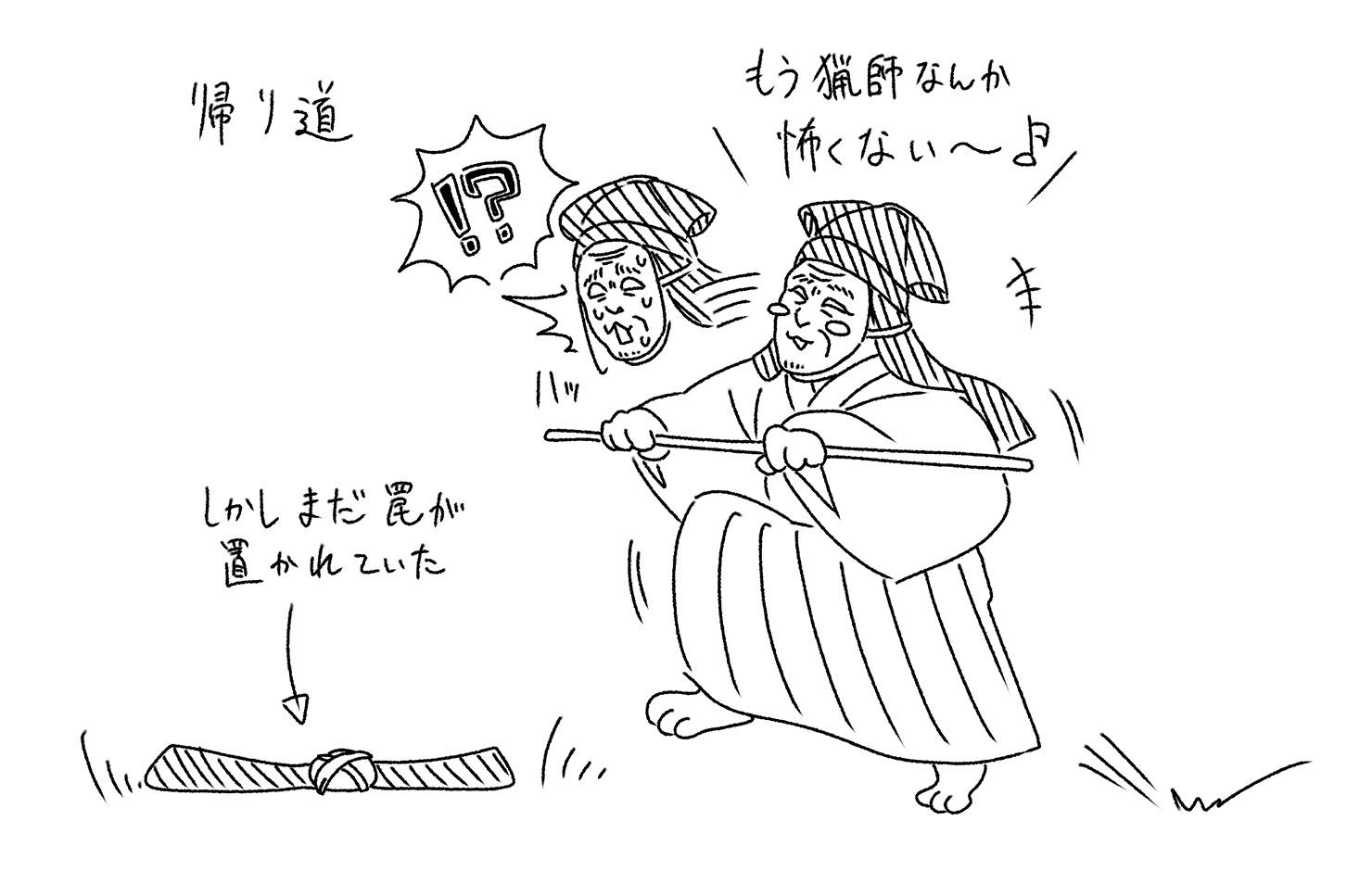 まんまと釣りを思いとどまらせたと思った白蔵主は、ウキウキ気分で帰途につきます。小歌(民間で流行していた短い歌謡)を口ずさむくらいに上機嫌です。