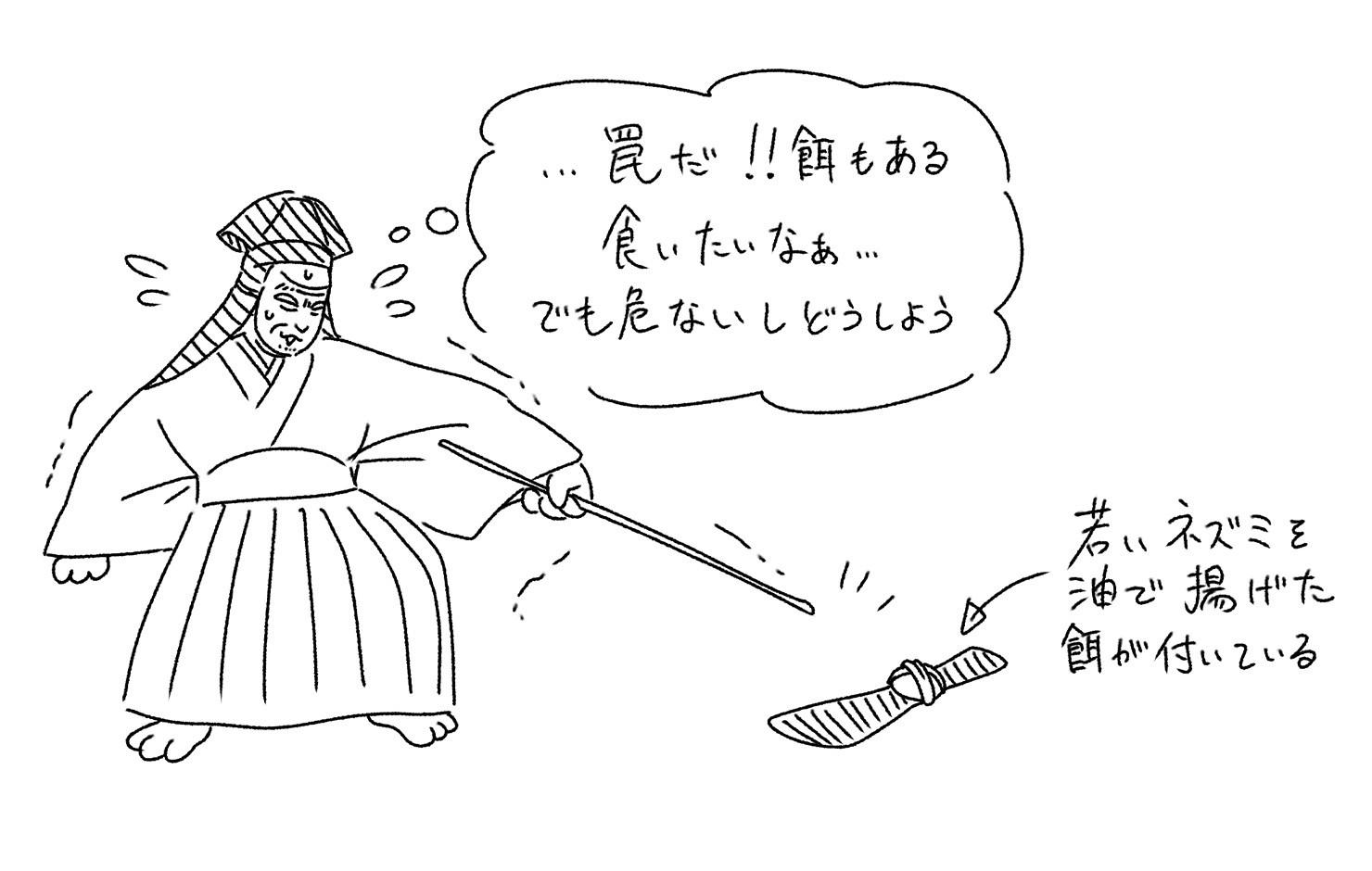 そして囮として付けられている餌に気付きます。それは若い鼠の油揚げで、狐の大好物です。若い狐たちが大勢罠に掛かったのも道理だと納得しつつ、自分も食べたい欲望が沸き起こります。