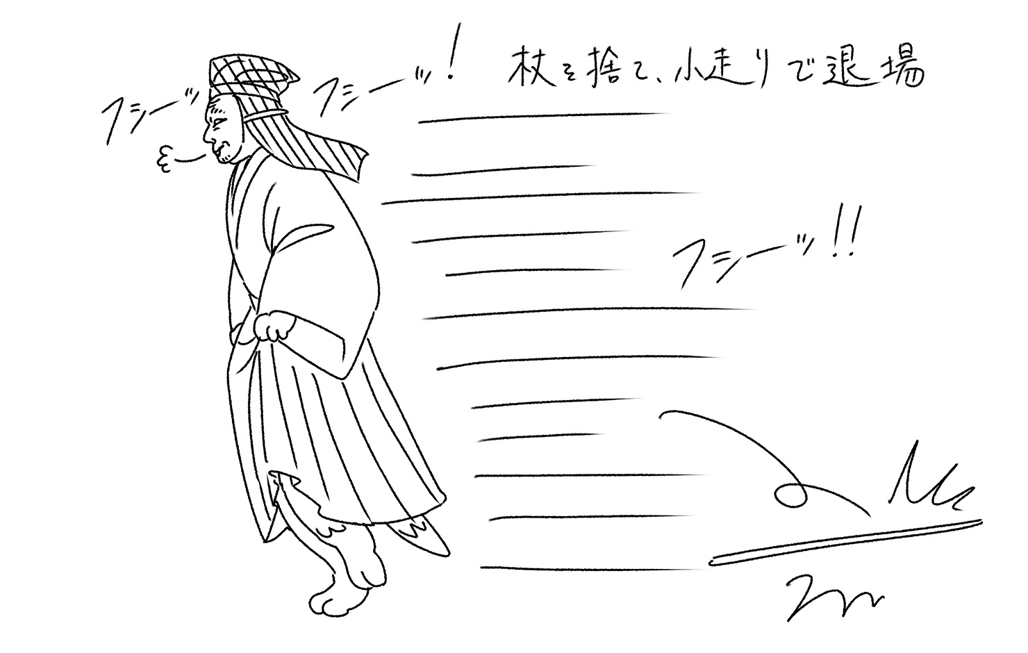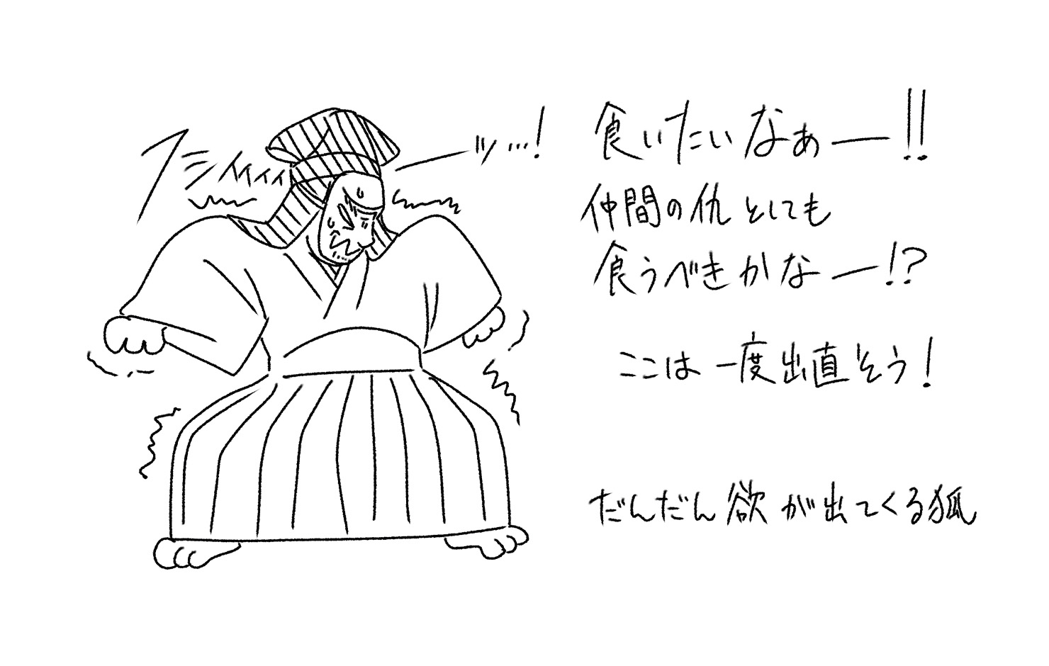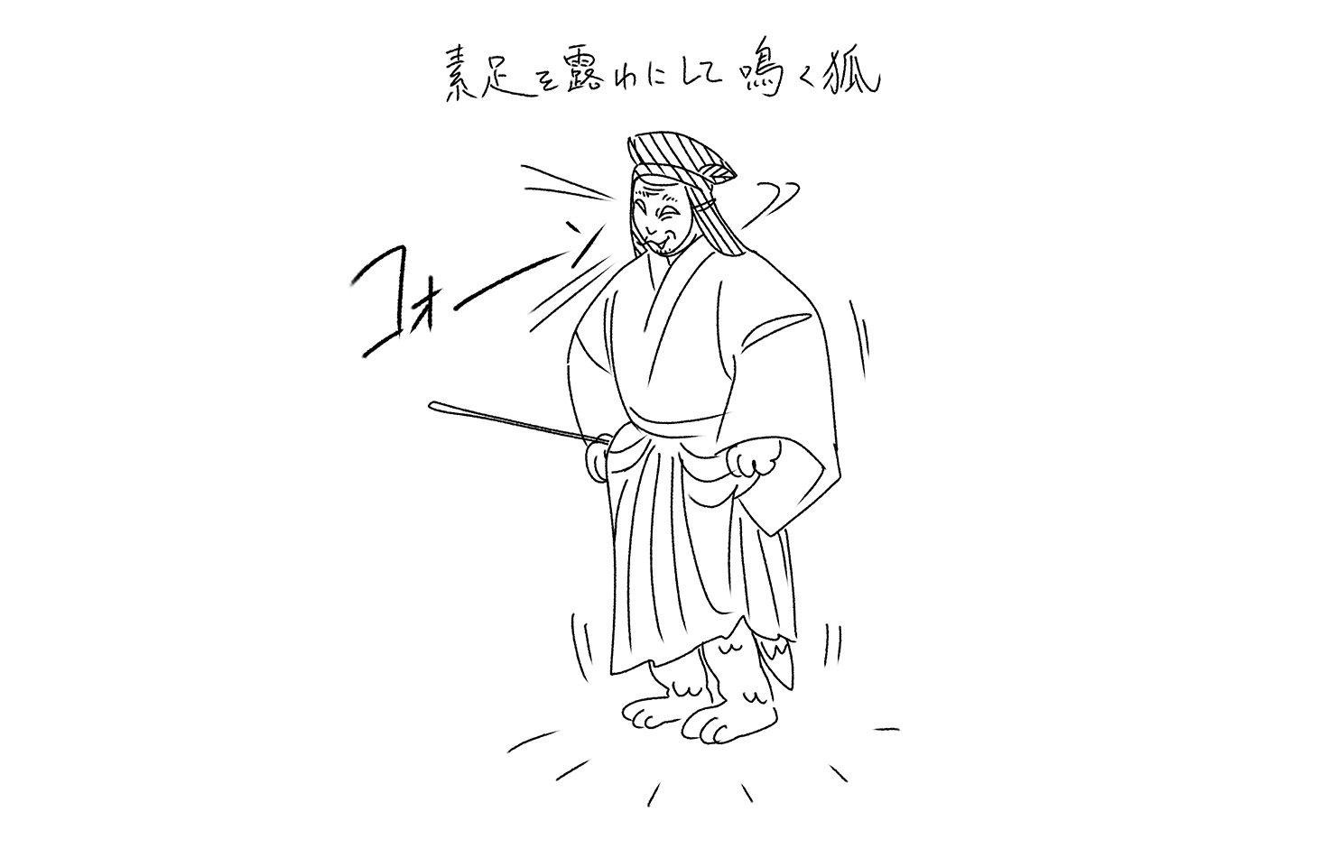 白蔵主に化けているという意識をかなぐり捨て、最後は膝まで白蔵主の衣を引き上げ、狐に返っているような様相ですっ飛んでいきます。