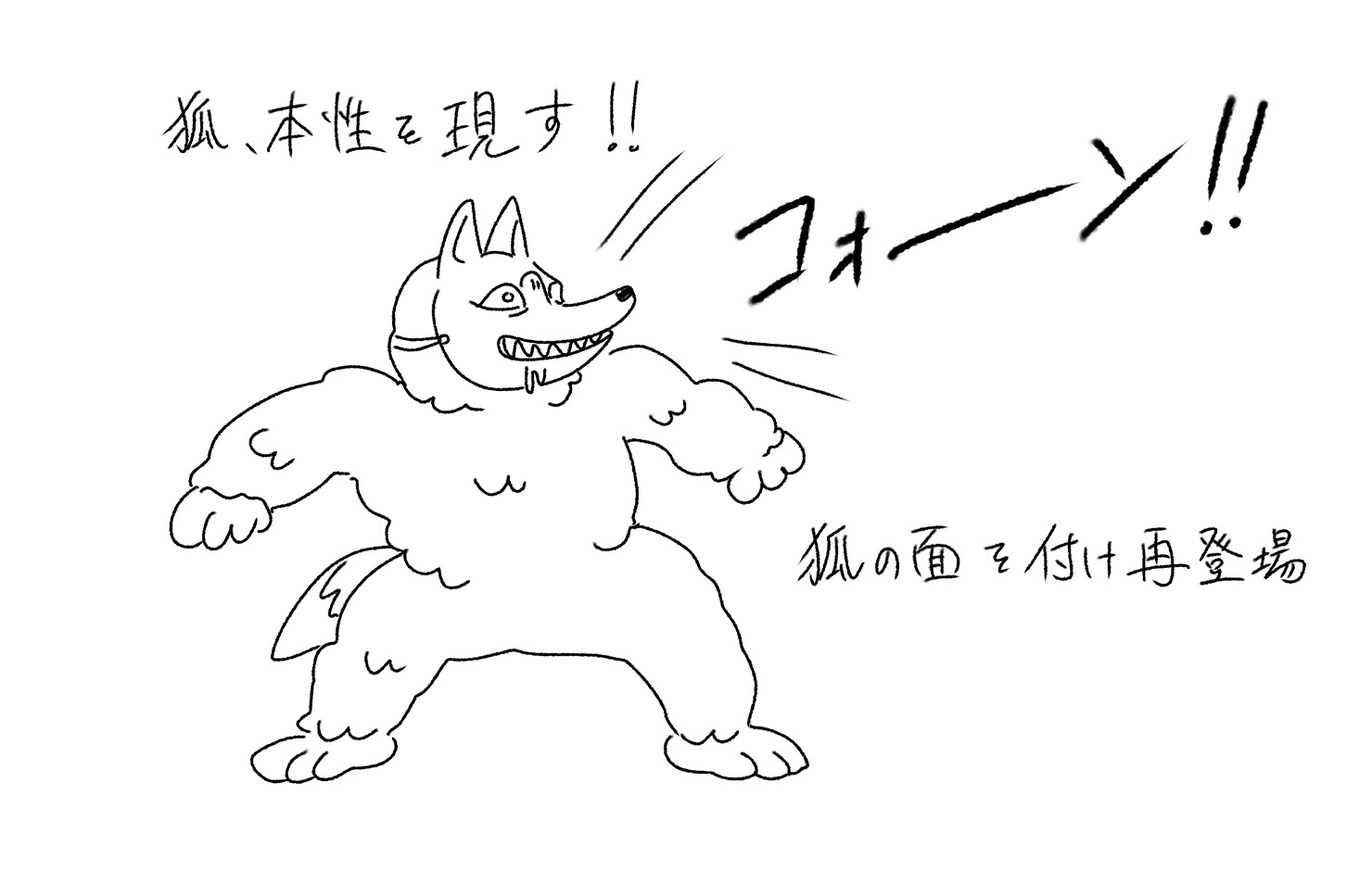 前シテの白蔵主の演技も、人間とはほど遠い獣的な態度や仕草ですが、狐の面を掛け、着ぐるみだけの姿で再登場すると、狐そのものに成り切って、舞台を所狭しと駆け回ります。