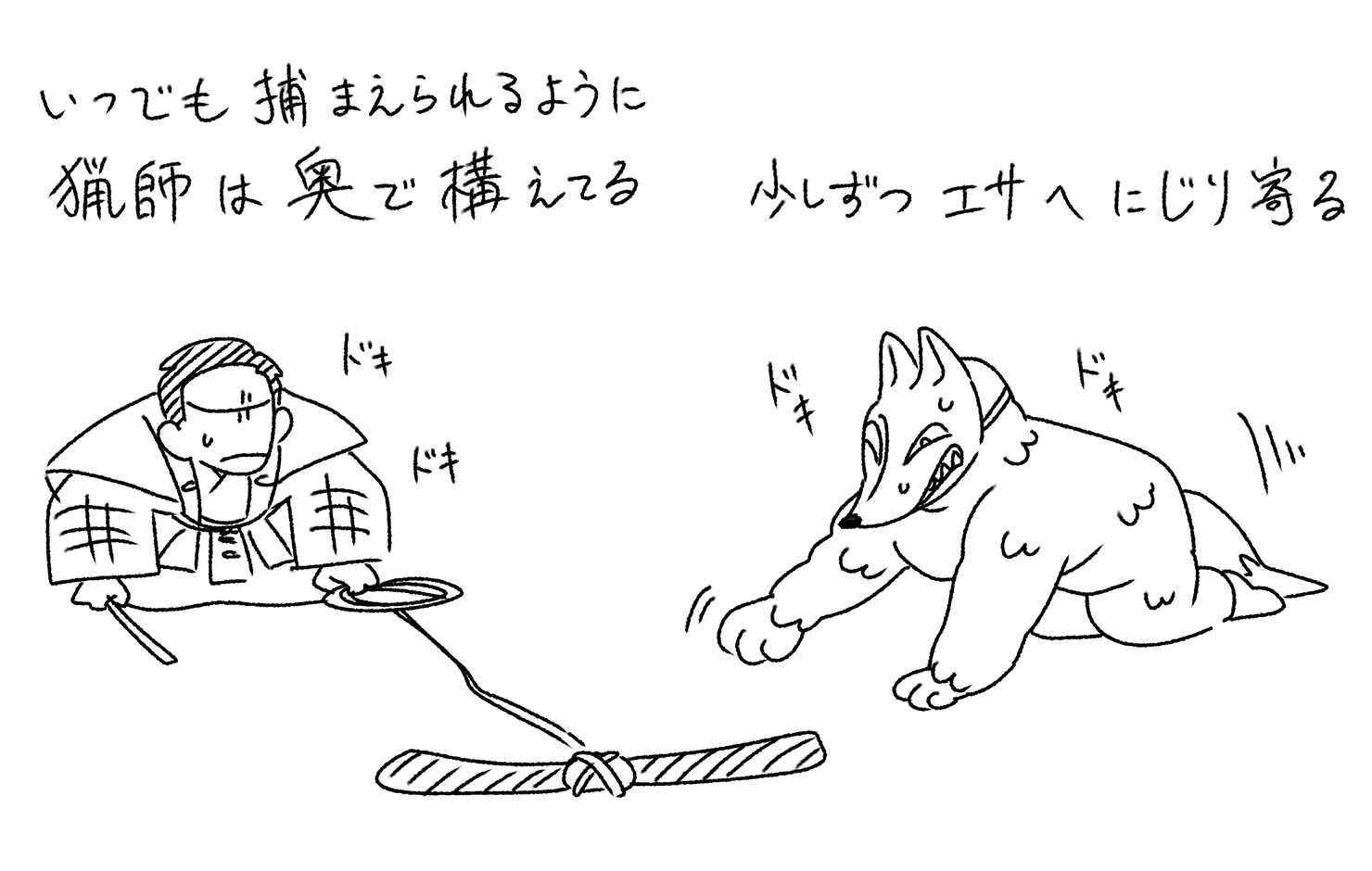 罠に掛かると、その綱で首が絞められる仕掛けのようですね。舞台を大きく使って、首に掛かった綱を後ろから猟師が締めたり緩めたりしながら、追い詰めていきます。この場面は、二人の狂言師が呼吸を合わせてタイミング良く演じないと、どちらかが舞台から転げ落ちてしまいます。