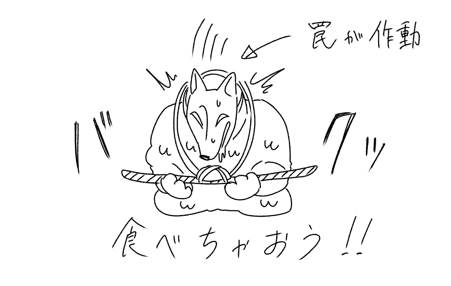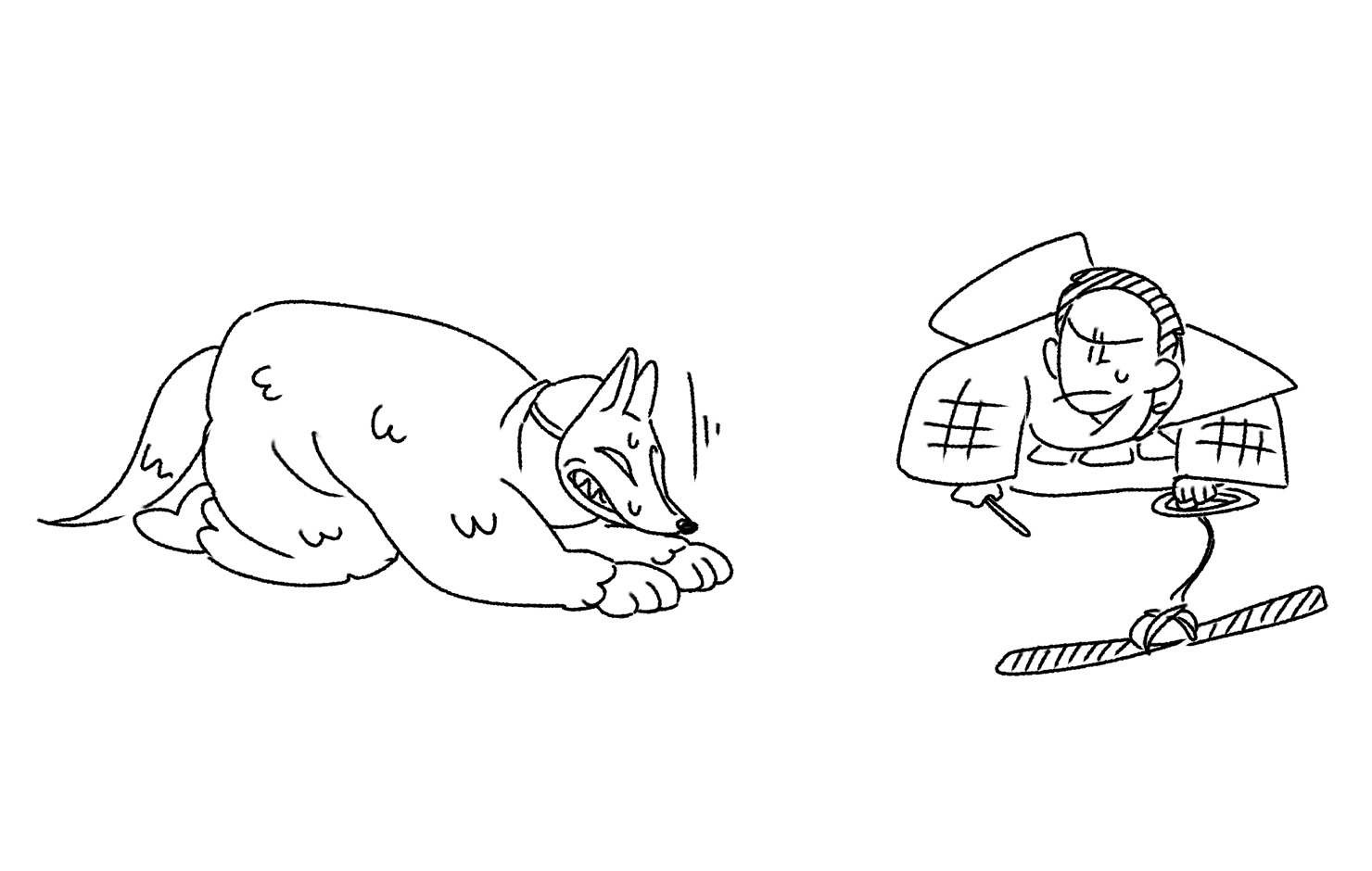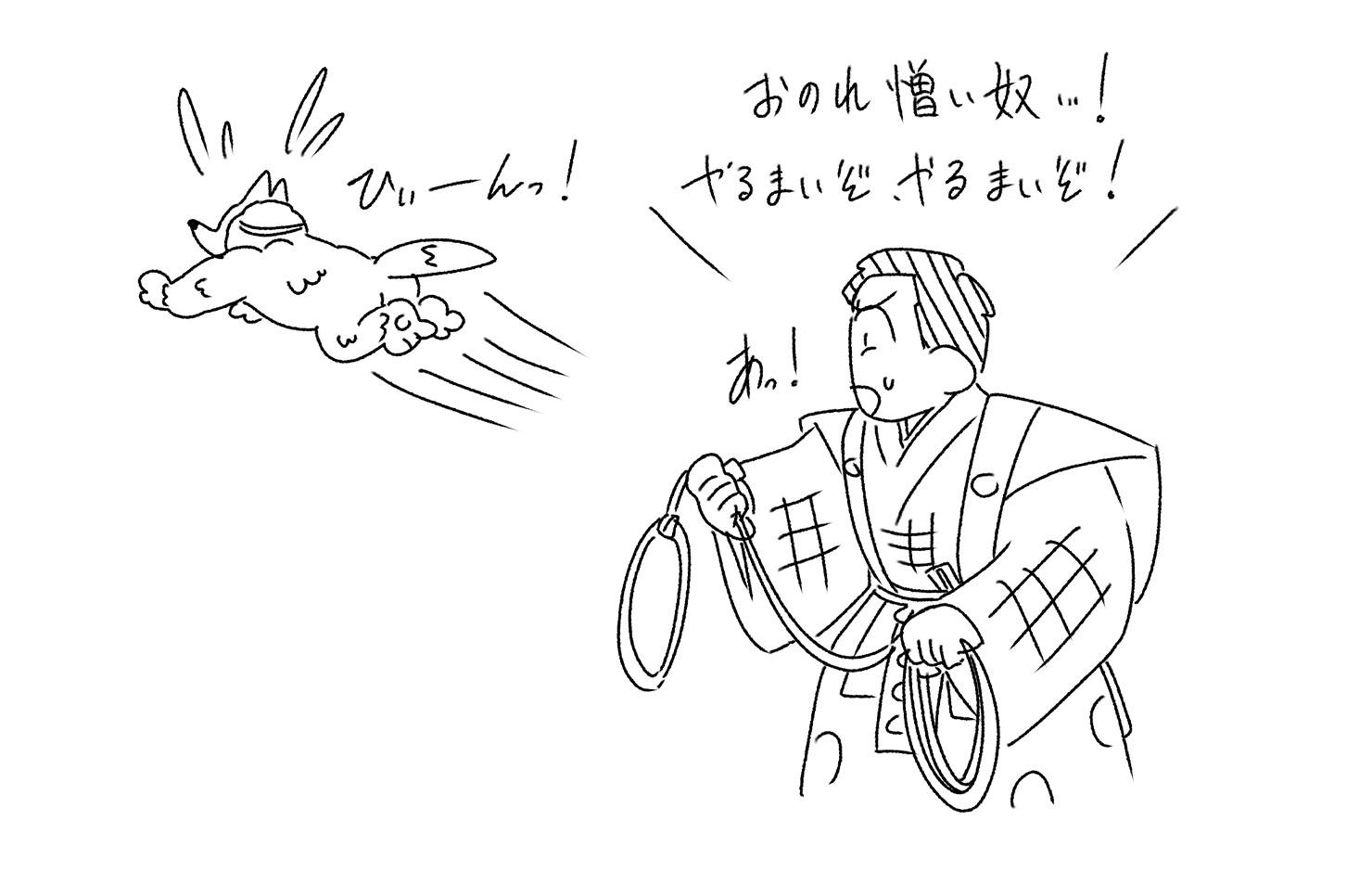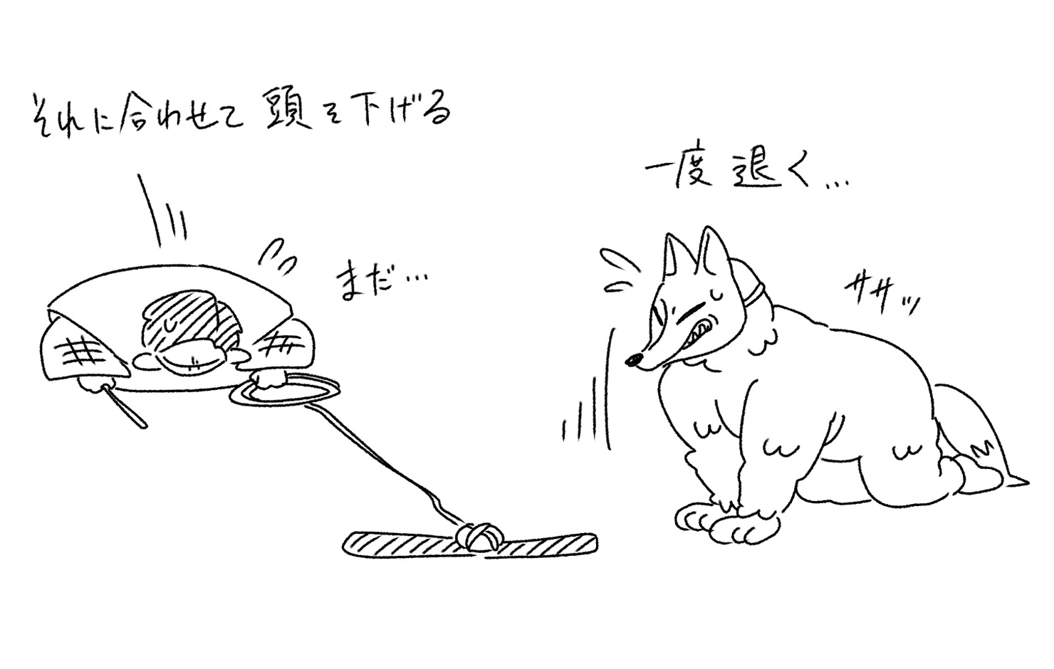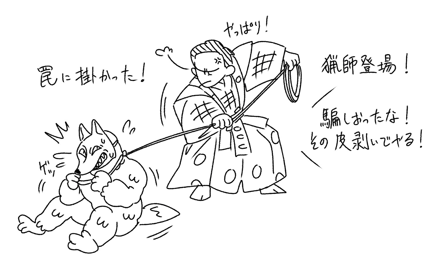 最後は狐が手で輪から首を抜いて、狐は逃げていきます。